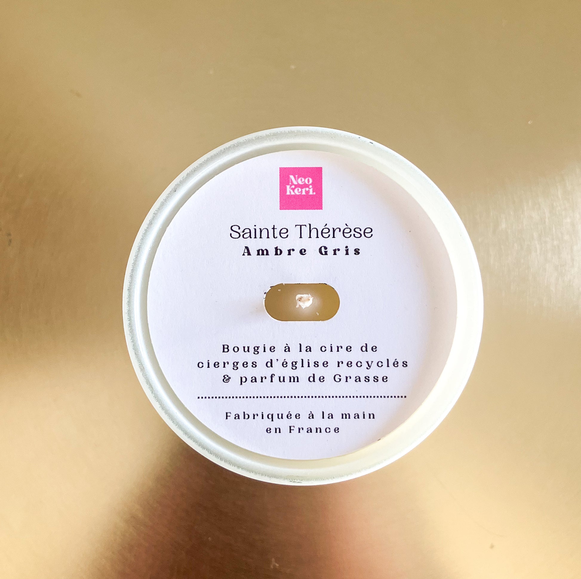 - Cire : Recyclée à partir de fins de cierges d'églises. Cire minérale et/ou cire d'abeille.